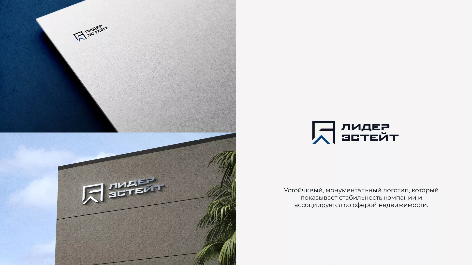Разработка логотипа в Калачинске для агентства недвижимости «Лидер Эстейт». Устойчивый, монументальный логотип, который показывает стабильность компании и ассоциируется со сферой недвижимости.